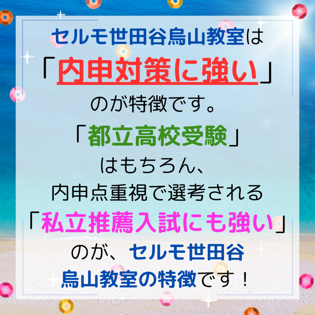 セルモ世田谷烏山教室はもともと「内申対策に強い」のが特徴です。その結果、当然、内申点重視で選考される「私立推薦入試内申対策」にも強いのがセルモ世田谷烏山教室の特徴です!